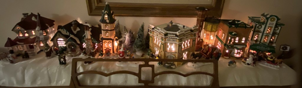 My Christmas Village—including pieces which I’ve had for decades—is now adorning my piano, and the soft lights remind me that Thanksgiving and Christmas are around the corner, that I will be able to while away hours with the people I love most. As I stare into the beloved buildings and townspeople, I find myself wishing to be in that village—to be back in a time, my childhood perhaps, where there was right and wrong, up and down, facts and opinions.